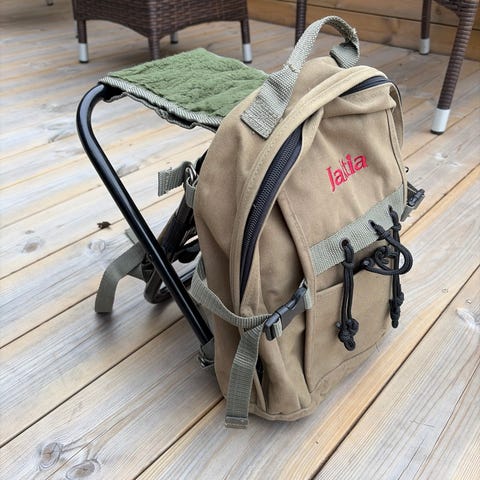 Brokared ryggsäck med integrerad stol i grön färg. Ryggsäcken har flera ytterfack med dragkedja och nätfickor på sidorna för extra förvaring. Underdelen är förstärkt med ett svart parti som tål slitage och fukt. Stommen består av en hopfällbar metallram som fungerar som sittstol, med vadderad sittdel upptill. Passar för exempelvis friluftsliv, fiske eller jakt där både packning och sittplats behövs i samma produkt.