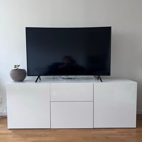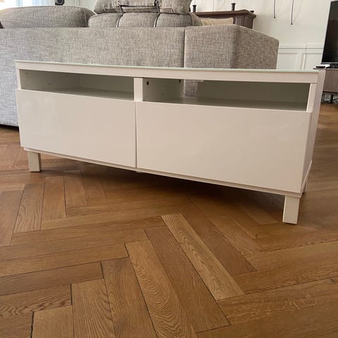 Bestå TV-bänk/skåp med lösa glasskivor ovanpå. 120 cm + 60 cm.