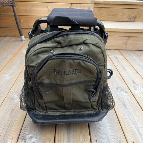 Jaktia ryggsäck med integrerad sittstol i beige tygmaterial. Ryggsäcken är monterad på en hopfällbar metallstomme som fungerar som stol, med grön vadderad sittdyna. Flera ytterfack och remmar för fastsättning av utrustning. Passar för exempelvis jakt, fiske och friluftsliv där både packning och sittplats behövs i ett och samma plagg.