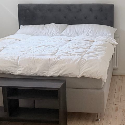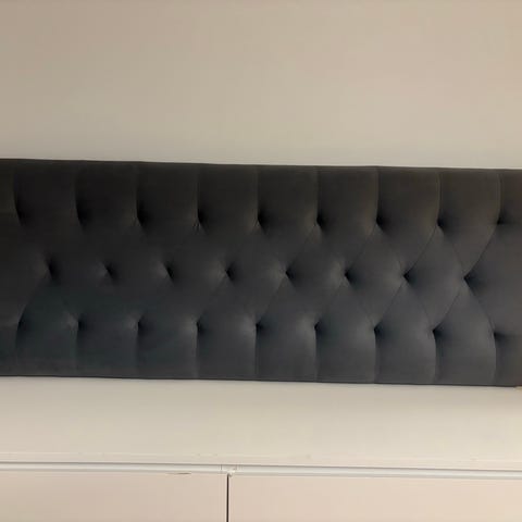 Specialtillverkad sänggavel ifrån tapetserare. Klädsel Nevotex Ritz som kostar 1250:-/ meter.