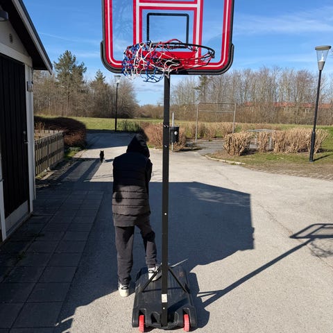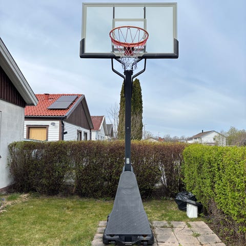 Pure basketkorg på fot i svart färg. Korgen är monterad på en fristående stolpe med plastfot som kan fyllas för ökad stabilitet. Rektangulärt backboard i plast med markerad träffyta. Passar för utomhusbruk på uppfart, gård eller liknande ytor där man vill spela basket utan att fästa korgen i vägg eller mark.