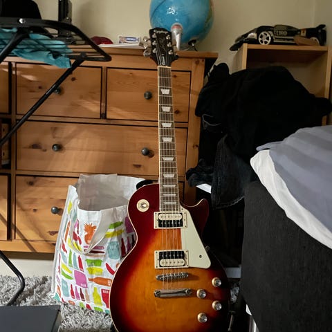 Hagstrom elgitarr i brun träfinish. Kropp i single cutaway-modell med två humbucker-mikrofoner, treläges pickupväljare samt separata rattar för volym och ton. Stopp-tail stall och kromad hårdvara. Greppbräda med blockinlägg och bandmarkeringar. Fantastisk gitarr, helt i class med Gibson Les Paul. Ganska lätt för att vara en Swede. Kommer i tidsenligt hardcase.