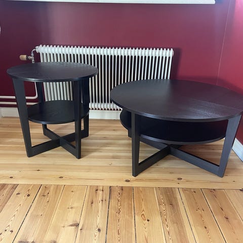 Storlek på det stora bordet är 85cm i diameter och det lilla bordet är 63cm i diameter.