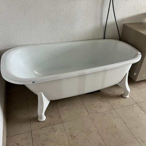 Fristående badkar i vitt utförande. Badkaret står på ben/stativ och är anpassat för placering mot vägg.