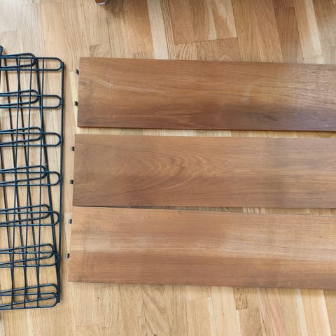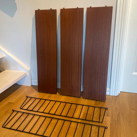 Äldre stringhylla med en hel del år på nacken. Finns repor och märken på hyllplanen och skav på gaveln. Saknar en gavelkompis.