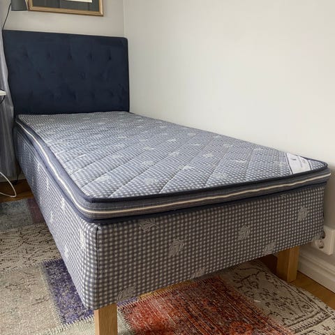 Säng i storlek cirka 90x200 cm. Sängen har beige tygklädsel runt om och står på ekben. Passar som enkelsäng i sovrum, gästrum eller tonårsrum. Bäddmadrass ingår ej.