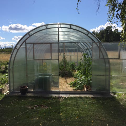 Passar för odling av växter, förvaring av krukor och trädgårdsredskap eller som enkel uterumsplats. Växthuset står på mur av limmade stenblock som ingår.
