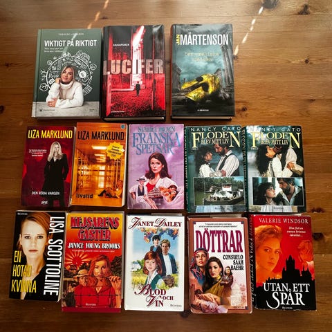 Böcker med blandade författare och titlar i både pocket- och inbundet format. Innehåller främst skönlitteratur, bland annat romaner, deckare och thrillers. Böckerna är på svenska. Pocket 10:-/st