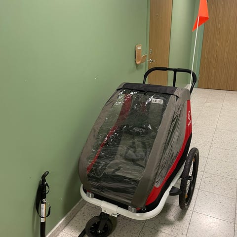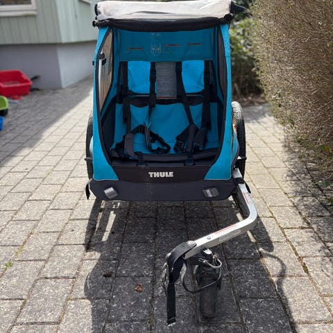 Fin cykelvagn som även går att använda som promenadvagn. Två sittplatser. Har förvarats inomhus när den inte används så den har inte blivit solblekt. Framtill finns ett nätfönster med uppfällbart regn- och vindskydd i klar plast. Bakom sittdelen finns lastutrymme för packning. Vagnen är utrustad med två bakhjul och ett dragfäste fram för montering på cykel. Väl framme tar du enkelt av vagnen från cykeln och monterar på framhjulet så har du en jättebra gåvagn. Mycket praktiskt!