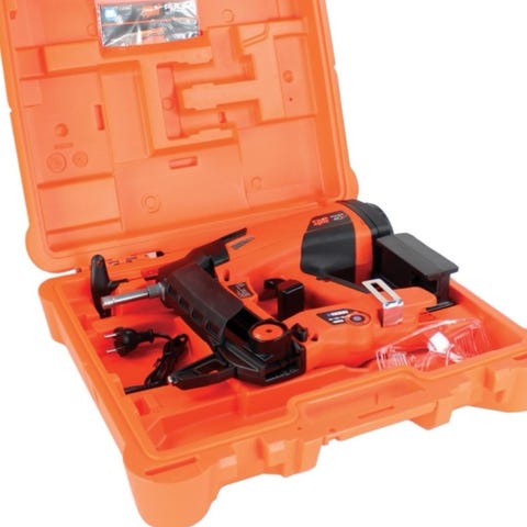 Essve spikpistol i plastväska. Levereras i grön hård plastväska med plats för verktyg, tillbehör och dokumentation. Spikpistolen drivs med tryckluft och är avsedd för spikning i trä och liknande material vid bygg- och snickeriarbeten. I väskan ingår bland annat oljeflaska och manual enligt bilden.