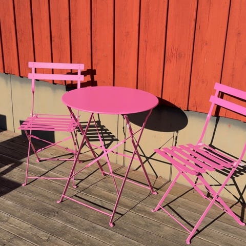 Cafémöbelset bestående av ett runt bord och två stolar i lila metall från Fermob. Bordet har rund bordsskiva och hopfällbar konstruktion. Stolarna har ribbad sits och ryggstöd samt är hopfällbara för enkel förvaring. Passar för uteplats, altan eller balkong.