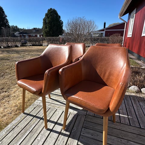Jättefina stolar i brunt i konstläder och ben i metall
