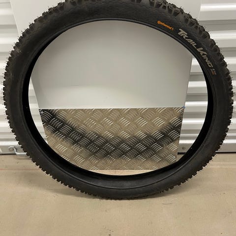 Cykelhjul med däck i storlek 26 x 2.10. Grovmönstrade däck från Bontrager lämpliga för terräng- eller mountainbikebruk. Fälgar med ekrar, ett hjul med monterad kassett. Passar cyklar som använder 26-tums hjul med denna typ av fälg och däckdimension.