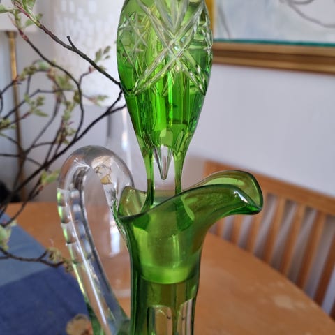Italiensk stor vas i keramik med blomformad öppning. Vasen är utformad som flera vita blommor med gröna blad runt foten. Färgerna går i vitt, grönt och inslag av ljusbrunt. Passar för snittblommor eller som dekorativ inredningsdetalj.