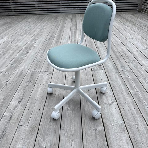 IKEA barnstol i form av en mindre skrivbordsstol för barn. Stolen har grön sits och ryggstöd med vit stomme och kryssfot på hjul. Höjden är justerbar för att passa olika bordshöjder och barn i olika längd. Passar som stol vid skrivbord eller pysselhörna i barnrum.