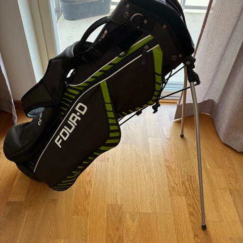 Future golfbag med ställ i blå färg. Väskan har bärremmar och utfällbara ben för att kunna stå upp på marken. Flera fack för klubbor och tillbehör samt regnöverdrag upptill.