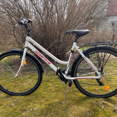 Yosemite damcykel med 28 tum hjul i vit färg. Cykeln har 7 växlar med växelreglage på styret. Utrustad med framkorg, pakethållare bak, stöd och reflexer.