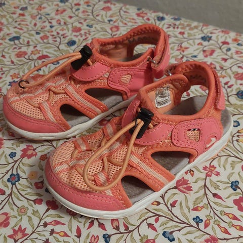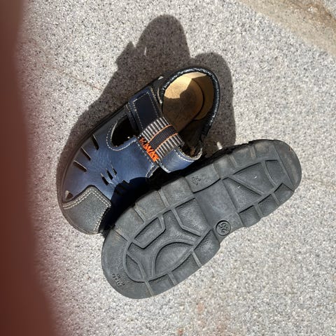 Sommarsandal med skydd för tå. Så lätt att skrapa upp tårna annars när man springer och leker. Tyg som andas kring fot. Kardborreband både över fotrygg och bakom häl för att justera storlek till bra komfort. Kardborren fungerar fortfarande bra!