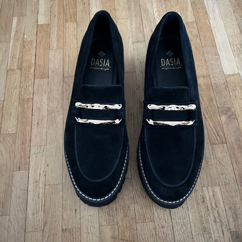 Modellen är en klassisk loafer som passar för vardag och enklare festliga tillfällen. Överdelen är i ett glansigt material och innersulan är slät för bekväm passform. Jag har aldrig använt den, köptes för 2500kr kunde inte lämna tillbaka då datumet passerades för att göra retur.