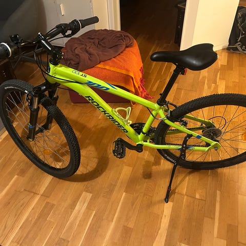 Cykeln har färgen Grön, Orange, Svart och köptes ny 2021. Den säljs nu pga att den är för liten. Normalt slitage över lag samt även på vissa delar på ramen, men funkar bra.