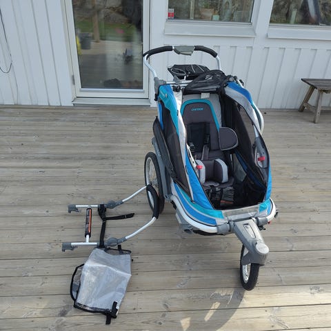 Thule cykelvagn i blå färg. Vagnen har plats för 2 barn med sittsele och fempunktsbälte. Dragstång till cyckel medföljer men inte själva fästet för cyckel.