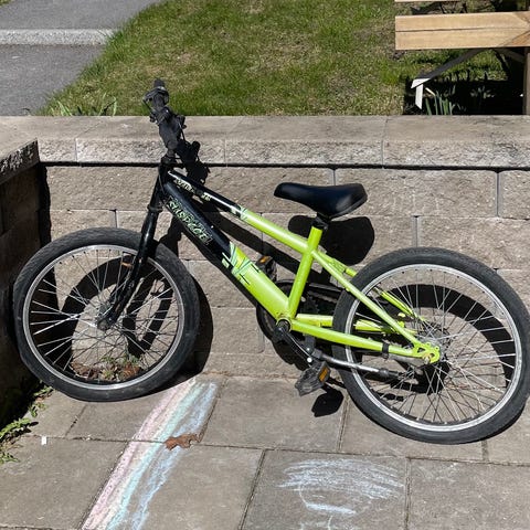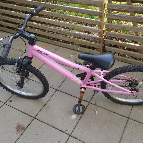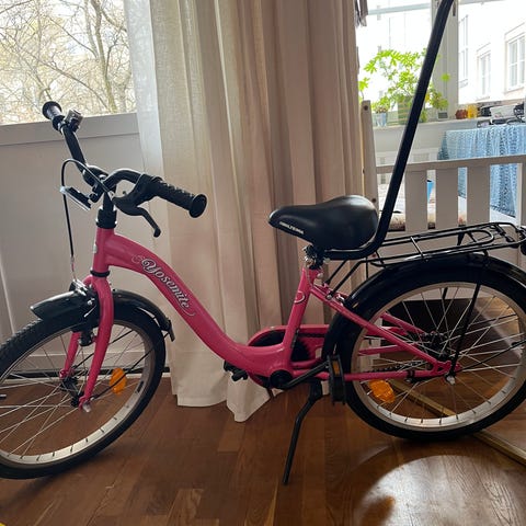 Bra och stabil barncykel med fotbroms, pakethållare och en handbroms för framhjulet.