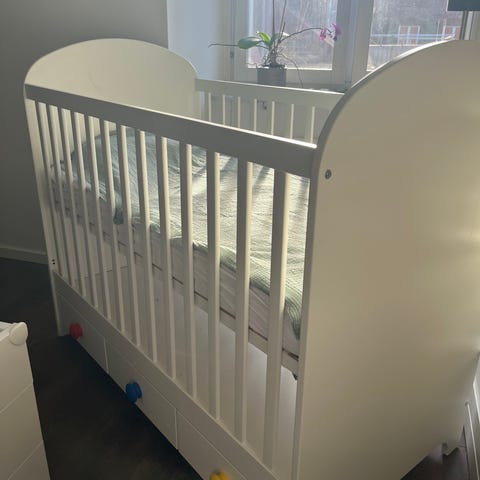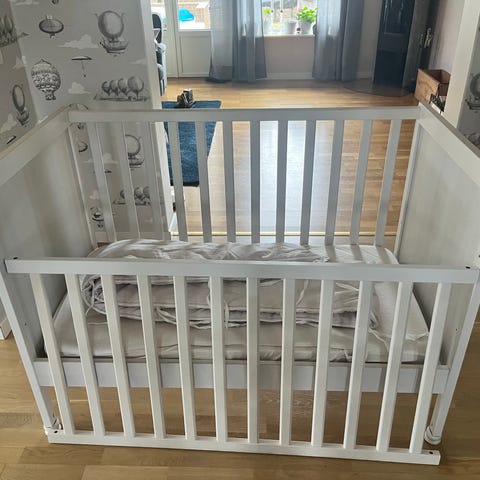 Spjäla i vit färg. Klassisk barnsäng med spjälor och öppen på en sida, med ribbotten. Sängen är avsedd för små barn, upp till ca 4 år.