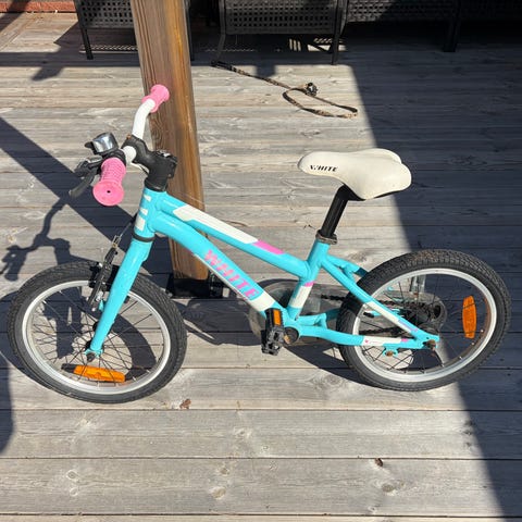 Barncykel med fot- och handbroms, reflexer och ringklocka.