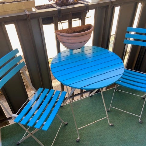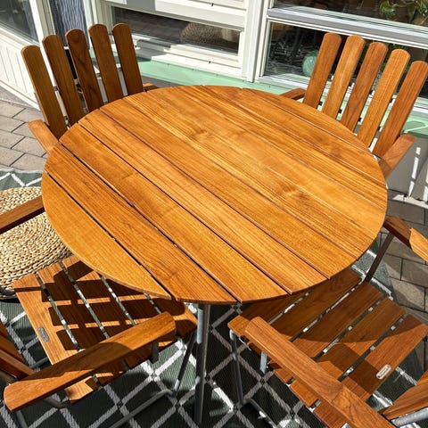 Trädgårdsgrupp från 60-talet bestående av runt bord och fem stolar. Bordsskivan är i trä och målad blå med synligt slitage, benen är i metall. Stolarna är röda med sits och rygg i träslanor och metallstativ.