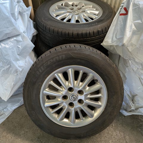 Kompletta hjul med sommardäck i dimension 205/55R16 monterade på lättmetallfälgar.