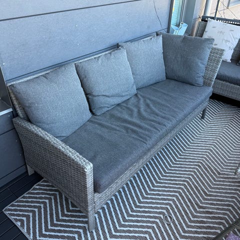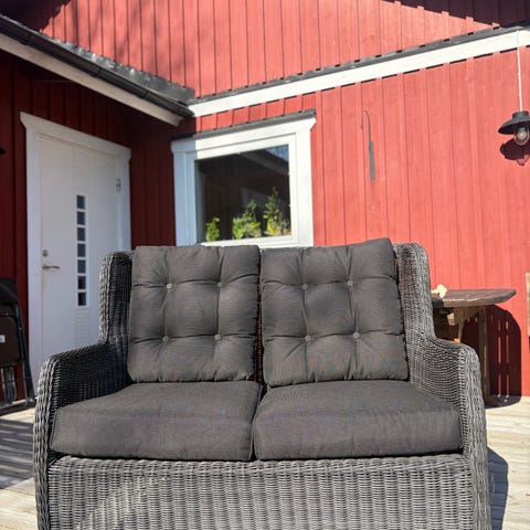 Soffan har stått i min mammas inglasade uterum i ca 1,5 år men behöver säljas nu på grund av flytt. Soffan är i nyskick och dubbel klädsel medföljer, grå som sitter på och vit som är oanvänd.