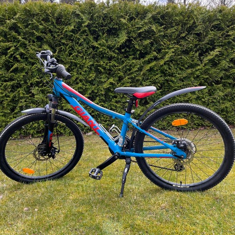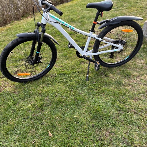 White barncykel med 24" hjul. Cykeln har framgaffel med dämpning, raka styre och handbromsar fram och bak. Utrustad med stänkskärmar och stöd. Passar barn som vuxit ur mindre barncykel och behöver en cykel med större hjul för vardagscykling och enklare turer.