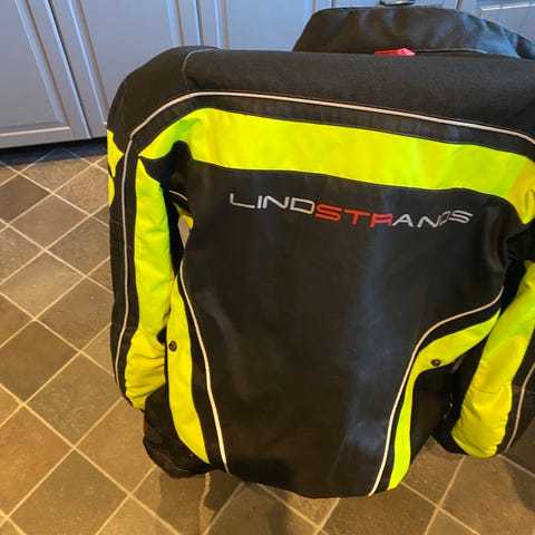 Jacka: Yamaha Racing motorcykeljacka i textil med svart grundfärg och blåvita detaljer. Jackan har hög krage, dragkedja med tryckknappar och flera sömmar och paneler anpassade för motorcykelkörning.