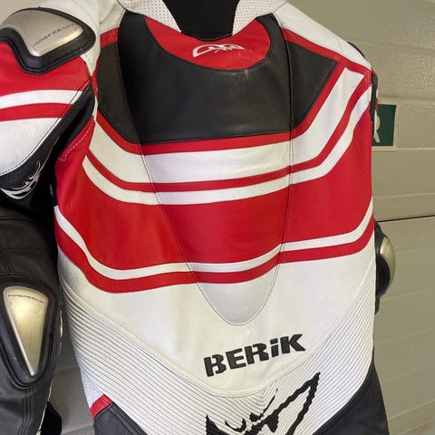 Handskar: Matchande motorcykelhandskar i svart läder med blå och vita detaljer. Handskarna har förstärkningar och skydd över knogar och fingrar samt justerbar rem vid handleden.