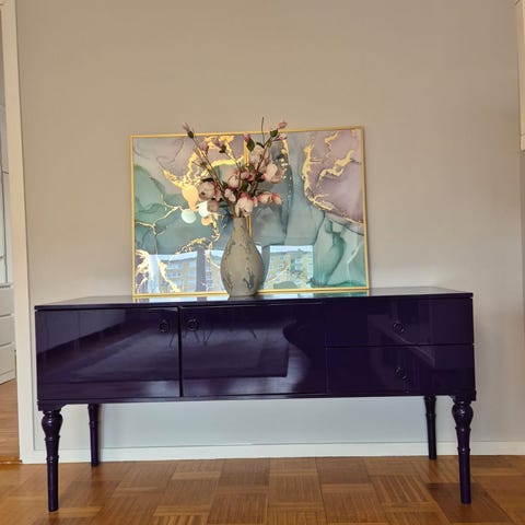 Stilren och rymlig skänk i ek med gott om förvaring. Passar perfekt i vardagsrum, matsal eller hall. Obs. tung.