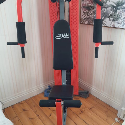 Hemmagym 7 olika tränigsmetoder 2,40 m lång 185 cm hög bredd 90 cm ca ,bra skick och många bra olika träningar vikter ca 100 kg .