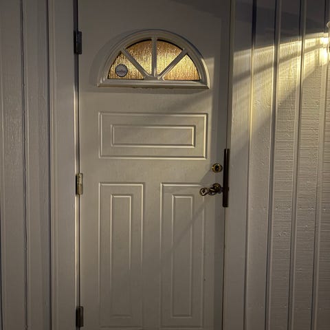 Vit ytterdörr med tillhörande karm. Dörren är utrustad med handtag och två låshus, vissa beslag och håltagningar syns på bilderna. Passar som ytterdörr till förråd, garage eller liknande utrymme. Har en stålplatta inuti, därav inbrottssäker men också rätt tung.