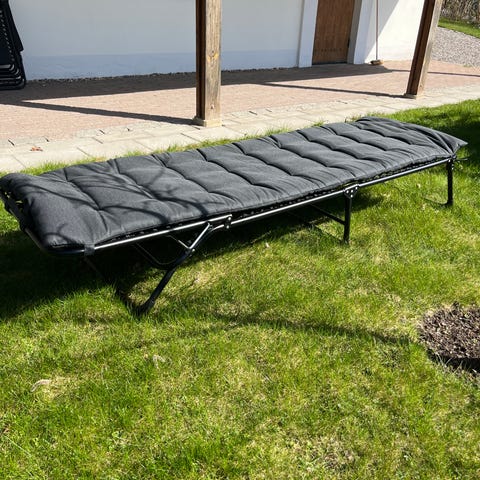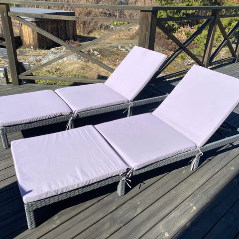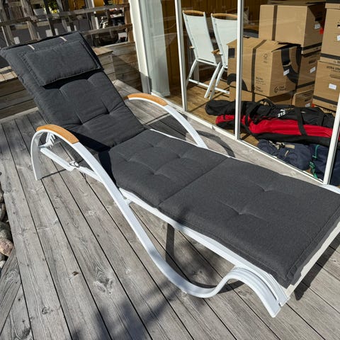 Två solstolar i trä med justerbara ryggstöd. Stolen har hjul baktill för enkel förflyttning. En solsäng med dyna 600 kr, båda två för 1000 kr inklusive dynor. Köpta på Jysk.