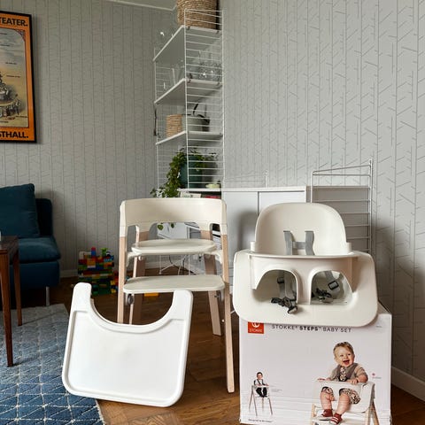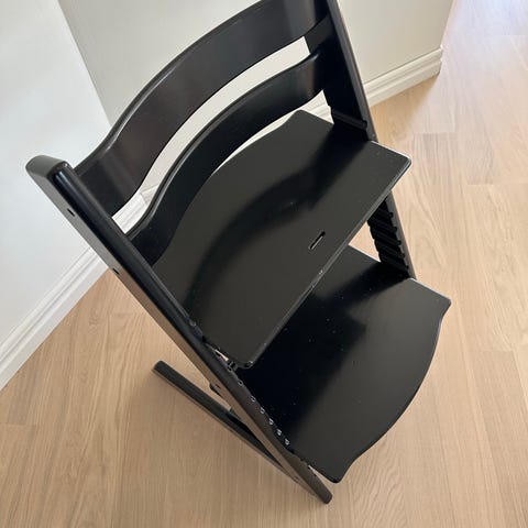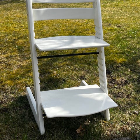 Stokke Tripp Trapp matstol vitt trä. Justerbar sitthöjd och fotstöd som kan anpassas efter barnets storlek. Stabil konstruktion anpassad för användning vid matbord. Passar för barn som kan sitta själva och uppåt, beroende på tillbehör och montering. Stolen är utformad för att barnet ska kunna sitta i rätt höjd vid bordet och ge stöd för både rygg och fötter.