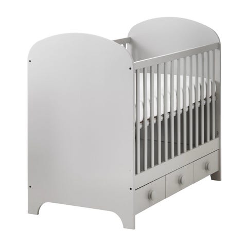 IKEA spjälsäng i grå färg. Klassisk spjälsäng med ribbor runtom och tre lådor undertill för extra förvaring av till exempel sängkläder eller leksaker. Passar små barn/baby och är avsedd att användas med madrass i standardstorlek för spjälsäng (madrassstorlek kan variera beroende på modell). Lämplig som sovplats i barnrum eller sovrum.
