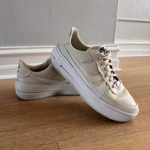 Nike sneakers i storlek 39. Modellen är låga med snörning och perforerad tå för ventilation. Skorna är i en ljus, vit färg med klassisk Nike-logotyp på sidorna och gummisula. Passar vardagsbruk och fritid.