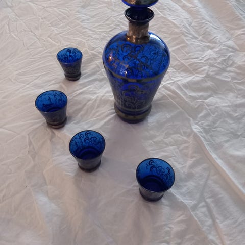 8 stycken dricksglas i grönt glas med silverinläggning. Inga sprickor eller nagg.