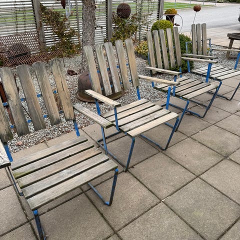 En klassisk Grythyttan trädgårdsgrupp med runt bord och fem stolar i trä och metall i original.