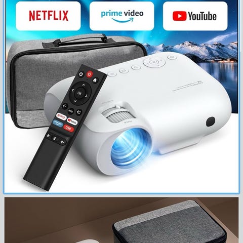 Huawei projektor i vit färg. Kompakt modell med inbyggt stativ/fot och nätkabel. På baksidan finns anslutningar som HDMI, USB och ljudutgång samt ventilationsgaller. Levereras med fjärrkontroll med grundläggande styrknappar för meny, volym och navigering. Lämplig för anslutning till externa enheter via HDMI eller USB för visning av bild och video på duk eller vägg.