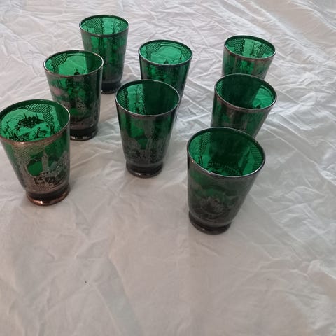 Karaff samt fyra likörglas. Blått glas med silverinläggningar. Inga sprickor eller nagg.