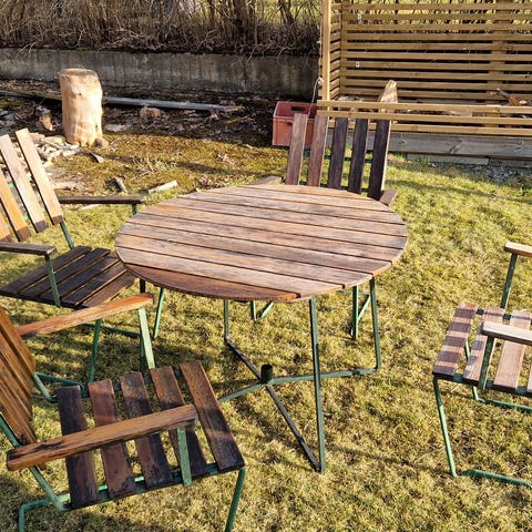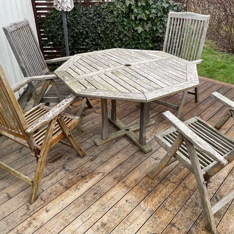 Trämöblerna är i behov olja och/eller behandlas för önskat utseende och skydd mot väder.