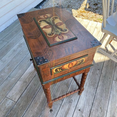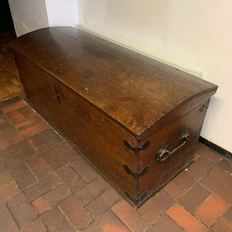 1800-tals förvaringskista i trä. Kistan har rejäla metallbeslag och handtag på sidorna. Invändigt finns rymligt förvaringsutrymme samt en mindre utdragbar insatslåda för mindre saker. Passar som förvaring i vardagsrum, hall eller sovrum och kan även användas som soffbord eller bänk tack vare den plana ovansidan.