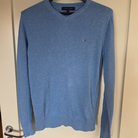 Tommy Hilfiger V-ringad tröja för herr i storlek S. Tröjan är blå och tillverkad i Pima cotton cashmere . Modellen har lång ärm, ribbade muddar och ribbad nederkant. Liten logotypdetalj framtill på bröstet. Passar som vardagströja eller att bära över skjorta eller t-shirt.