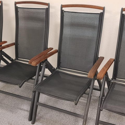 8 st positionsstolar med Hillerstorps dynor. Fällbara i flera lägen. Kraftigt trä , teak. Har stått inomhus alltid på