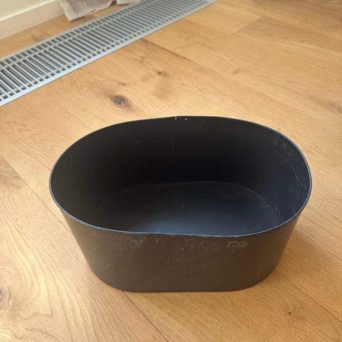 Blomlådor i svart metall med oval form. Utrustade med upphängningsbyglar för montering på räcke eller balkongkant. Passar för plantering av blommor eller örter utomhus eller inomhus där upphängning på kant är möjlig. Säljes som två likadana lådor.